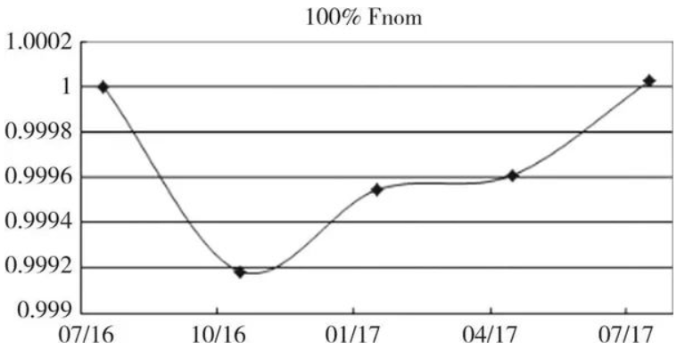 測力儀的檢定周期是依據(jù)測力儀長期穩(wěn)定度或示值誤差的連續(xù)考核時(shí)間給出的。對新制造的、經(jīng)過調(diào)修的和使用不當(dāng)?shù)刃阅懿淮_定的測力儀,應(yīng)適當(dāng)縮短檢定周期,一般為半年。某新制造的測力儀溫度系數(shù)較大,滿量程輸出的長期穩(wěn)定度歸一化曲線如下圖所示。由下圖可知:該測力儀在每年相同月份環(huán)境溫度相近時(shí),得到的長期穩(wěn)定度優(yōu)于0.01%,一年中實(shí)際示值變化量超過0.08%,半年檢定周期有助于發(fā)現(xiàn)該問題。半年檢定周期的測力儀后續(xù)延長至一年檢定周期,可參考下列步驟: