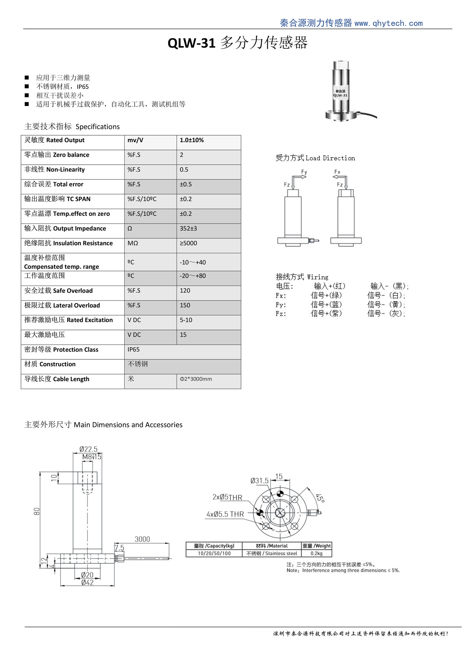 產品名稱:QLW-31多分力傳感器測三軸力(X、Y、Z)