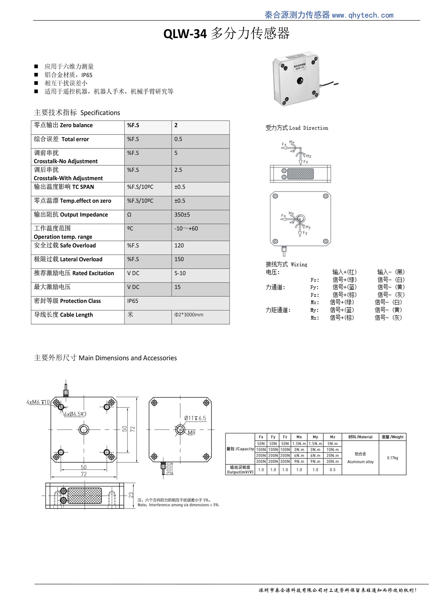 產品名稱:QLW-34六維力測力傳感器(3力值,3扭矩)