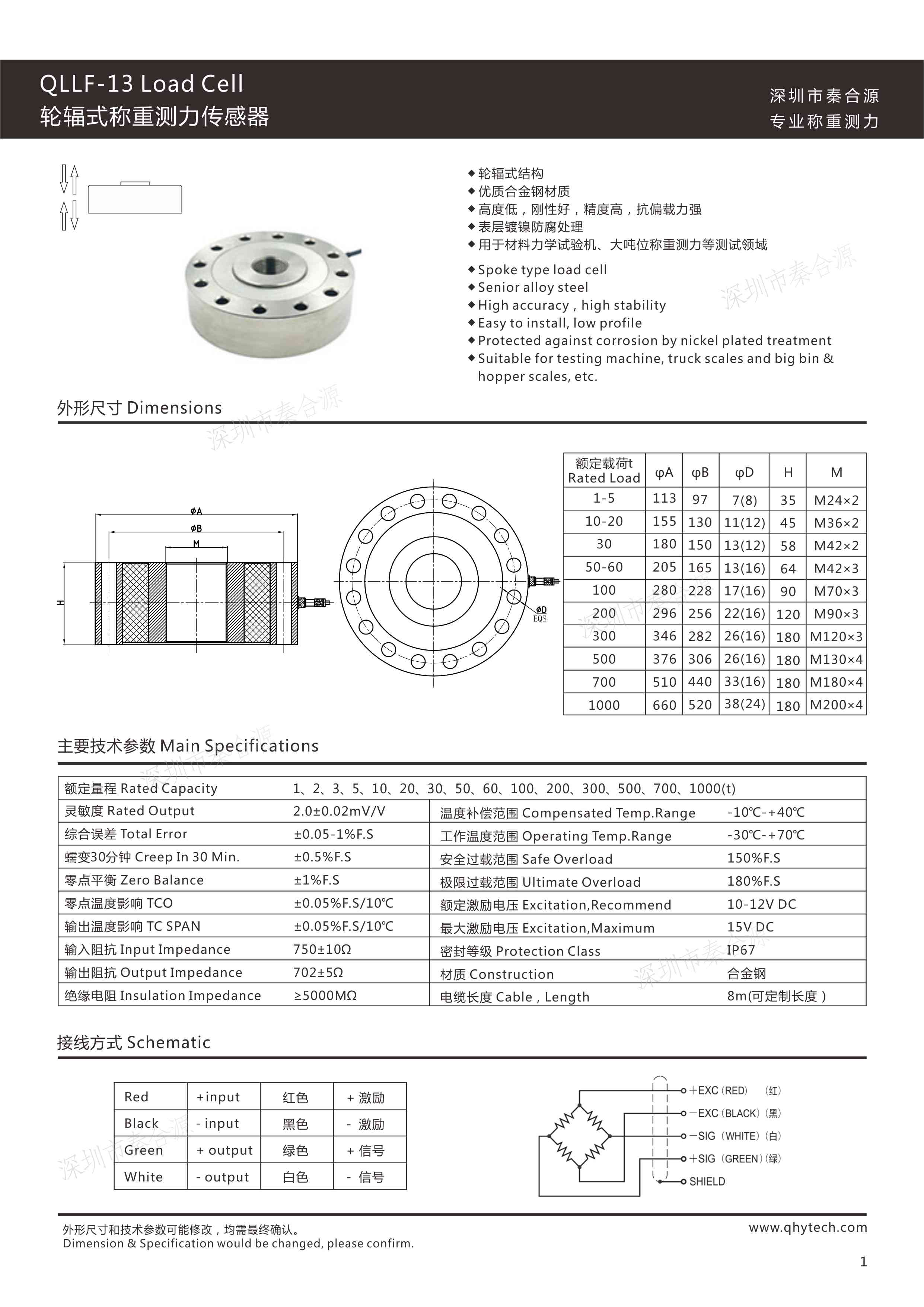 秦合源輪輻式傳感器,選用優質合金鋼,完全密封焊接,防水防腐蝕,高度低抗偏載力強,精度高測力精準,皮實耐用價格實在,適用于多種載荷力的測試,廣泛應用于各種電子稱、水泥配料倉、干粉攪拌機及工業自動化測量控制系統等。常規模擬傳感器輸出信號(靈敏度)為mV信號(0.5mV/V-3mV/V),稱重儀表(測力儀表)可以接收mV信號,即時顯示力值,同時把mV信號放大為電壓信號(0-5V、0-10V)或者電流信號(4-20mA、0-20mA),同PLC對接。秦合源經驗豐富、技術精湛,為各行業用戶提供精準測力傳感器及測力方案。?