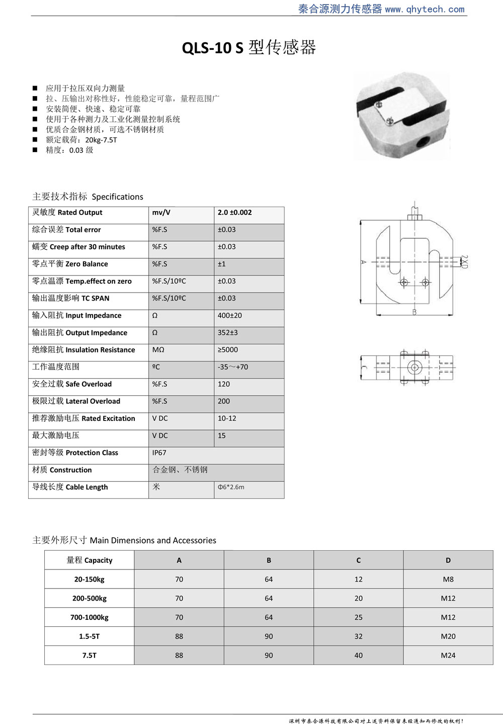秦合源S型測力傳感器,可以同時測量推拉兩個方向的力,此款傳感器精度高、安裝簡單、穩定性好、性價比高。常規模擬傳感器輸出信號(靈敏度)為mV信號(0.5mV/V-3mV/V),信號變送器(放大器)可以接收mV信號,同時把傳mV信號放大為電壓信號(0-5V、0-10V)或者電流信號(4-20mA、0-20mA),同PLC對接。